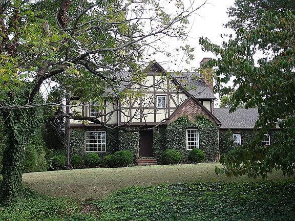 Two-story tudor-style home with prominent stucco and decorative half-timber features.