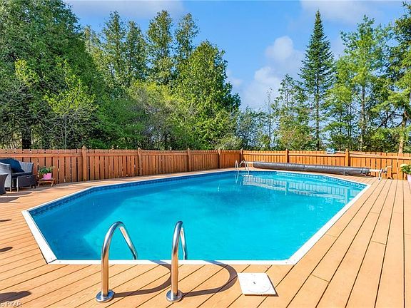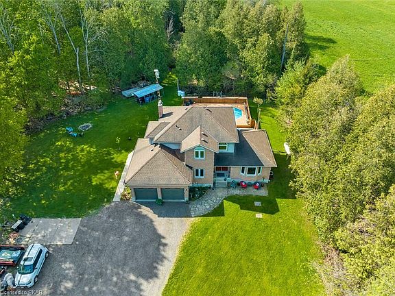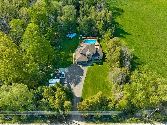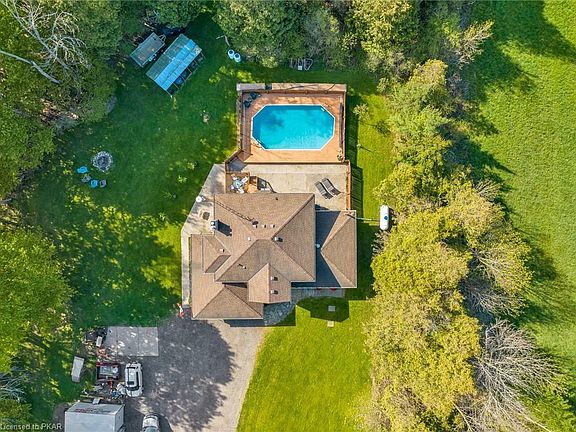 Rare opportunity to enjoy country living minutes to the city. 902 Laird Rd is situated on a private 1 acre lot with mature trees & forest. Entertain this summer outdoors by the pool, deck or firepit. Interior features include hardwood floors throughout, two fireplaces, newer windows with plenty of natural light and an updated kitchen with quartz countertops. The spacious dining room features vaulted ceilings and is perfect for hosting or could be converted to another living room. The downstairs has a spacious rec room with plenty of storage & cold cellar. Exterior features continue with a double car garage, landscaped gardens & parking for many. Minutes to the 401, perfect for commuters. Huge future business park development potential due to zoning if desired.