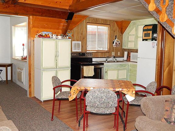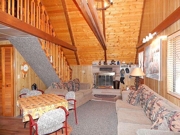 Swiss Chalet in the pines! This charming 1 Bedroom, 1.5 bathroom 1000sf home has sleeping loft and wood burning fireplace. Vaulted ceilings, two living areas and the master bedroom on the lower level make this the perfect family get-away! Beautiful level lot is fully fenced with majestic pine trees and one carport. Detached shed includes the washer & dryer. Covered back porch and intriquite swiss details on the exterior of the home. Home is all electric and has a heat pump for heating and cooling. No HOA!