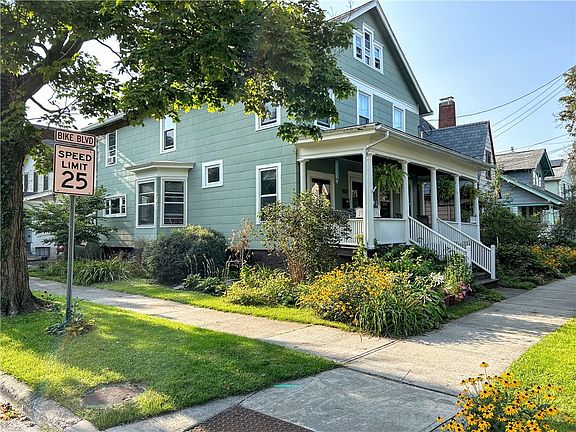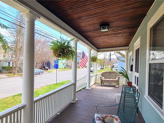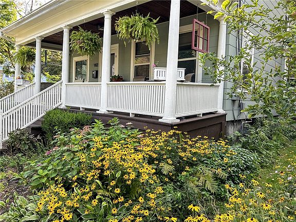 Nestled in the heart of Fall Creek, this classic late 19th-century City of Ithaca home offers three stories of versatile living space, beautifully combining original character with thoughtful modern updates. Step into the oversized entry foyer and be welcomed by rich natural woodwork, ornate columns, wide trim, French doors, and a stunning wrap-around staircase with a decorative soffit. The double parlor, separated by six-panel pocket doors, provides both a cozy living room and a family room with a charming bay window, while detailed original trim adds elegance between the family and dining rooms. A sun-drenched, south-facing bay window brightens the spacious dining area, featuring ceramic tile and bead board ceilings. At the heart of the home, the renovated kitchen shines with granite countertops, a center island breakfast bar, farmhouse sink, natural wood ceiling, and classic white cabinetry—perfect for entertaining. A renovated full bath with natural wood ceiling completes the main floor. Upstairs are four well-sized bedrooms, all with hardwood floors, updated windows, ceiling fans, and another full bath with a double-sink vanity. Hidden behind a built-in bookcase, you will find stairs to the finished third floor offering an additional 380 square feet of flexible space. Enjoy the sights and sounds of Fall Creek from the sweeping covered front porch, or relax on the west-facing rear porch at sunset. Surrounded by lovely landscaped beds, this centrally located home is just minutes from Fall Creek Elementary, Ithaca Falls, parks, downtown bus stops, and bike lanes. Open house Saturday 4/12, 12-1:30 PM. Offers reviewed 4/14.
