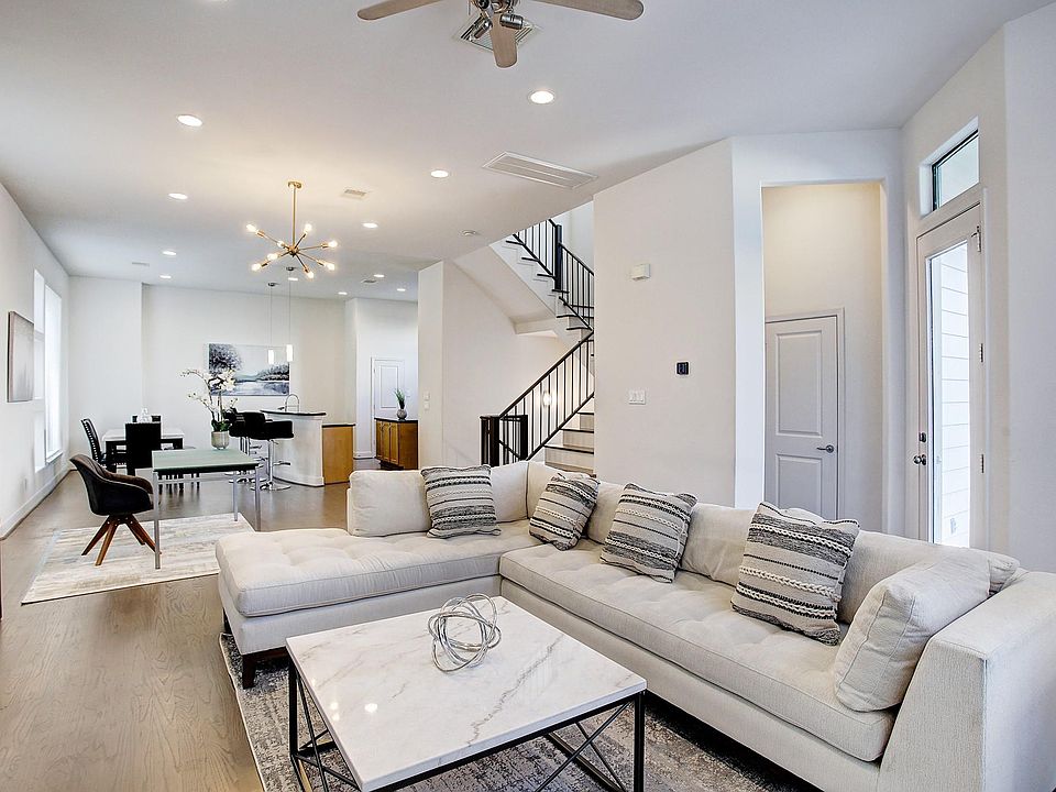 Fully furnished Contemporary recently renovated including Master shower with claw foot tub, Italian porcelain tile, New hardwoods in Master bedroom, closet and 2nd bedroom, closet. All existing hardwood were refinished 2nd level. New Italian porcelain tile installed 1st floor entryway, 3rd bedroom including new shower and granite bath counter. New LED lights installed with Fresh paint throughout. Great location by Memorial Park & walking distance to the Washington strip! Beautiful modern stucco ext. w/large living areas nestled in back with great light from 3 sides of house. Expansive 2nd level living room 11' ceilings w/fireplace and open kitchen w/SS GE appliances & island bar including balcony. 3rd floor has a 12 foot ceiling master retreat w/room for sitting area & huge master bath and walk in closet. small outside side yard. WALK TO RESTAURANTS.