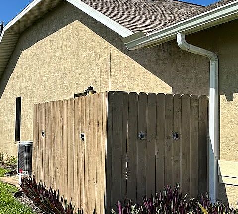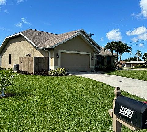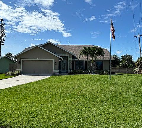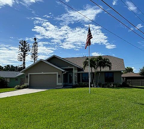 Gorgeous 3 bedroom, 2 bath split floor plan home. Flooring, kitchen, lighting and cabinets throughout remodeled in 2017. Roof and garage door replaced in 2021. Impact windows and impact front door added in 2023. Home is a unique layout and perfect for entertaining. Large porch with a spacious backyard that has plenty of room for a pool. Sprinkler system is already in place. Fencing around 3/4 of the back property. Close to shopping, dining and centrally located in Cape Coral. This home is move in ready and a must see!