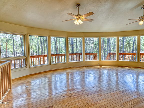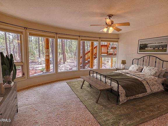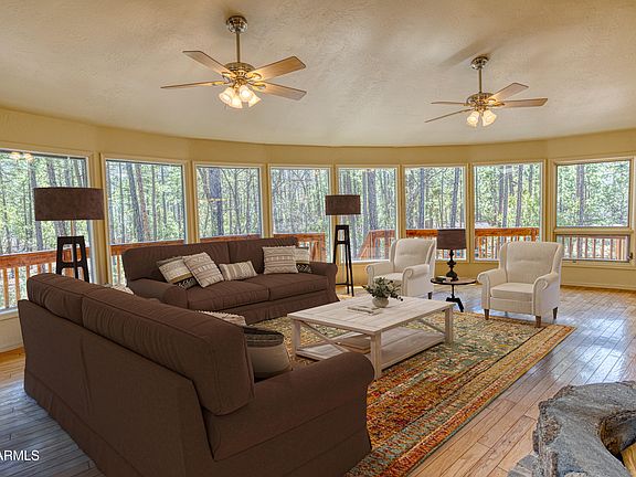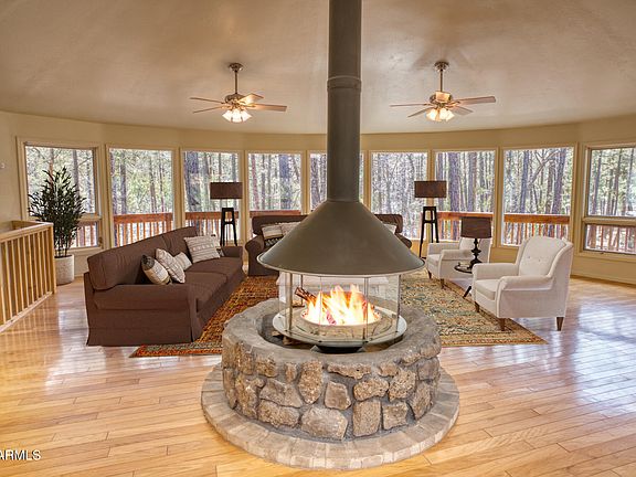 Prepare to be captivated by the VIEWS in the most unique cabin on the mountain on 1.51 acres. This stunning circular living space features expansive windows that invite the beauty of the towering pines and lush property indoors. At the heart of the room, a charming center fireplace adds warmth and ambiance, perfect for cozy winter nights. The flowing hardwood floors and tall, vaulted ceilings create a seamless and elegant atmosphere. Step onto the large wrap-around deck, ideal for enjoying both sunny days and starlit evenings. Inside, the spacious kitchen is perfectly designed for entertaining, with ample room for gatherings with a breakfast bar and a dedicated dining area. This home is close to shopping and eateries yet feels like you are in the middle of the forest. The first floor also has the third bathroom. This home has an ELEVATOR for comfort and ease of living that takes you downstairs to a thoughtfully designed living area, which includes two bedrooms and two bathrooms. The gorgeous large Primary suite boasts large windows, a luxurious raised stone soaker jetted tub, double pedestal vanities, and plenty of space to relax with a large walk in closet. The Guest bedroom is generously sized to ensure comfort for everyone with more views. There is a bathroom right outside guest bedroom. Downstairs there is a kitchette right off of the Office/Den/Entry for your ease and convenience. Outdoors, you'll find a charming seating area and a convenient two-car garage. This home is truly one of a kind - the beauty and unique features sets it above all else as you bring the outside in with tremendous views. This area of Pinetop has all custom homes on one acre minimum lots so there is ample room between you and the neighbors. The reservation is right across the road for added privacy. Also no HOA. There are 2 entrances to this home for extra ease for access. Imagine living in the White Mountains of Arizona where you have 4 beautiful seasons and where you can breathe in the fresh mountain air and enjoy the 40 lakes and over 600 miles of rivers and streams. In addition to the amazing fishing, this area has one of the most extensive trail systems in the southwest for hiking, biking, horseback riding, quadding and more. Sunrise Ski Resort is also just 40 minutes away with 3 beautiful mountains to ski, snow board or sled. If shopping is your interest, you will love the antique stores and the multitude of arts and craft shows that happen in the summer. The music festivals have something to fit everyone's enjoyment. Do you love to golf? There are 7 amazing golf courses, 3 that are public. The White Mountains, where this home/cabin is the best kept secret of Arizona! Come and explore and enhance your living! Pinetop-Lakeside was also voted 'Best Cabin Region in the U.S"... Embrace the MAGIC!