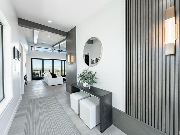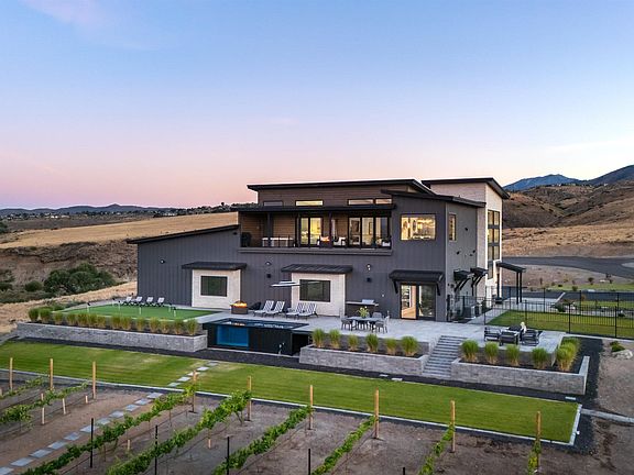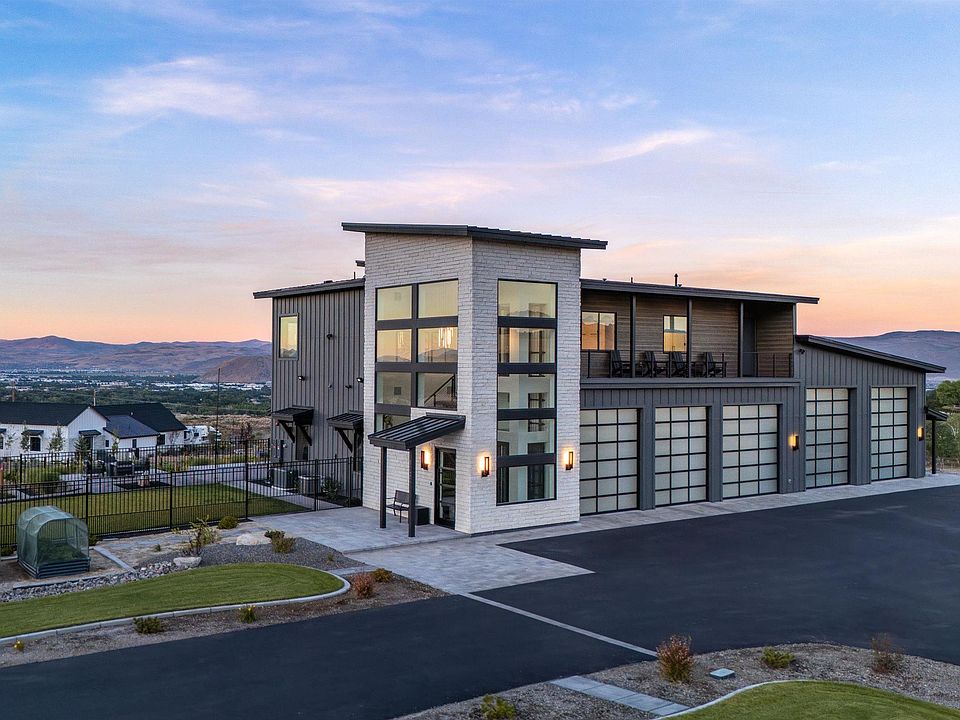 This ultra-cool custom home features an epic 4000+ sq. ft. garage that’s more showroom than storage space. With 5 glass doors, 3 deep bays, 2 RV-sized bays, plus an office/den and half bath, it's perfect for all your toys. A sleek glass elevator offers stunning views as it takes you to the condo-style living area, complete with 2 bedrooms and 2 baths. Enjoy light, panoramic mountain and city views with Peavine Mtn to the north, Virginia & Pinenut Ranges to the east, and Mt. Rose to the southwest., Enjoy breathtaking views of your private vineyard, featuring Riesling vines, from your inground spool with a glass viewing window. The property also includes a putting green, fenced dog yard, and an orchard with apple, cherry, and peach trees. Located in a gated community of four custom residences (three of which are complete), this home offers expansion potential into the garage area if needed. It’s equipped with a fire sprinkler system and a backup generator, and designer Milgard metal windows and doors.