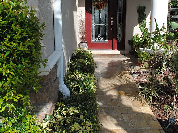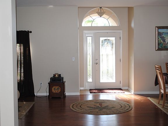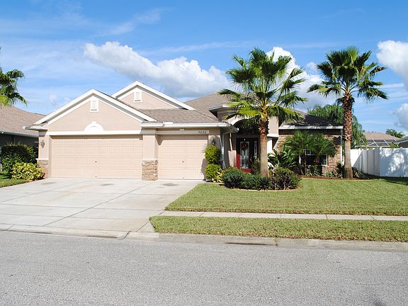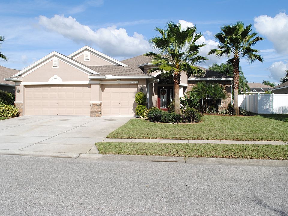 Great opportunity to own a 4 bedroom home with 3 full bathrooms and a MUST-HAVE 3 car garage with a STONE FRONT ELEVATION in a beautiful gated community. Upon approach via the TRAVERTINE WALKWAY through the LEADED GLASS FRONT DOOR with side and palladian lights, you'll be impressed by the HAND SCRAPED ENGINEERED WOOD FLOORS and open floor plan with a 3 way split bedroom design. The kitchen area features beautiful 48" CHERRY CABINETS, GRANITE COUNTERS, STAINLESS STEEL APPLIANCES, STONE BACKSPLASH, BREAKFAST BAR, A BREAKFAST NOOK AND RECESSED LIGHTS and is just off the family room with a convenient entertainment nook.The home also boast FORMAL LIVING AND DINING ROOMS. You'll love the LARGE MASTER SUITE with access to the lanai and a great master bath with garden tub, DUAL VANITY SOLID SURFACE COUNTERTOPS with UNDERMOUNT SINKS and boasts a VERY LARGE CLOSET. 2 secondary bedrooms share a bath and the 4th bedroom lends well as a GUEST SUITE with access to the 3rd full bathroom. You'll enjoy spending time on the covered lanai with CUSTOM BRICK PAVERS in your FENCED REAR YARD.The home feels much larger that the sq footage suggests. Other features include: NEW CARPETING, NEW WOOD FLOORS, A/C 2014, LOTS OF CLOSET STORAGE, CDD FEE IS IN THE TAXES AND ALL THE FURNITURE IS FOR SALE AND NEGOTIABLE. NOTE Culligan whole house water filtration & softening system leased