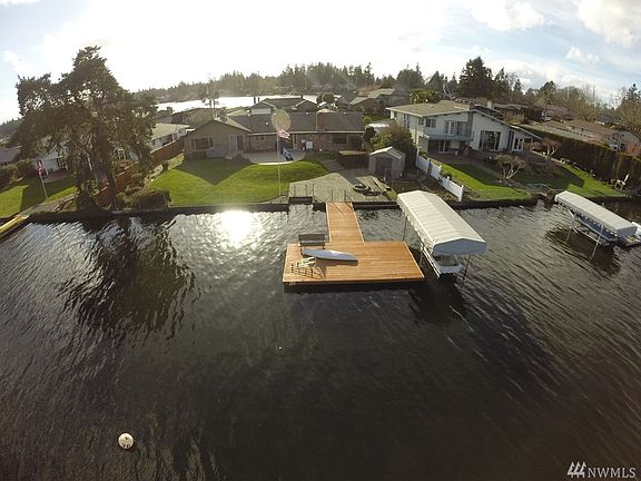 Rare Steilacoom Lake waterfront! Just in time for summer. 2300 Sqft Rambler, 4 bdrm, 2.25 baths, formal living and dining rms, huge family room all with amazing views of the lake. Both living and family rm have fireplaces. Stainless steel Maytag kitchen appliances. Over-sized 2 car garage. Terraced back yard with 2 patios lead to 100' of no bank frontage, fire pit, newly rebuilt dock, covered boat lift, storage shed for water toys. Grandfathered sprinkler system pumps directly from lake.