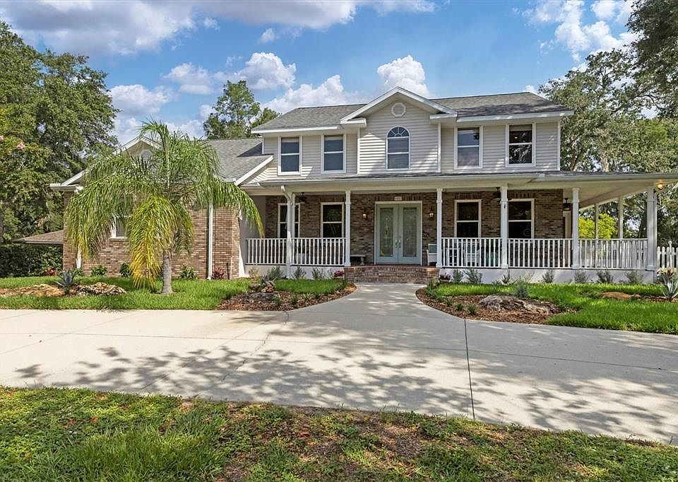 One of the most coveted lots in the Braden Woods subdivision, known for its oversized lots, treed canopy roads and lakeside living, is coming on the market. Situated on 1.22 acres, with over 200 feet of lakefront, this classic home sitting on a corner lot offers long lake views and privacy. As you walk up, you are greeted with an expansive front wrap-around porch, double-glass door entry and soaring ceiling heights. This spacious home is 3,761 square feet under air, 4,976 total, with four bedrooms and the upstairs bonus room with closet makes a great fifth bedroom, 3.5 baths and a two-car-garage. An added bonus, not easily found, is the detached RV garage with dual doors that is perfect for a boat, RV, additional cars and big-kid toys. Sitting separately on the property, this garage has its own driveway with an oversized carport pole barn next to it. The flexible design of the home fits the needs of those needing space, the professionals that need an office or the older family member that requires a first floor second primary bedroom. Giving a more current design feel, the kitchen, dining and great room are all open to each other and are ideal for entertaining or family events large and small. With four sets of glass doors and large windows, the natural light beams off the hardwood floors in the great room. For a true Florida lifestyle, the sparkling pool and spa, lighted gazebo or private dock will allure you to the serene views of the lake that are priceless day and night. Completing the first floor, you have a second primary bedroom with updated bath, a sizeable walk-in pantry, laundry room, guest half bath, office and den with pocket doors, and a separate dining and living room. The upstairs primary bedroom has a double-door entry, beautiful lake views and showcases dual walk-in closets, a large walk-in shower and soaking tub. Additionally, you have two more bedrooms, a bonus room that can easily be the fifth bedroom and a bath with a skylight. This timeless home has been lovingly maintained and updated over the past 10 years by its owners. Every aspect, inside and out, regularly serviced and maintained. This is a fantastic opportunity to own a home with plenty of storage with no more storage rentals that’s located in a much-desired school district. Braden Woods is a dog-friendly community, where you can be at Jiggs Landing in minutes or take the golf cart over to the local golf course. Just a 10-minute drive to the University Town Center shopping district, restaurants galore, medical services and more. Ask for the Feature Sheet for the home, attached to MLS.