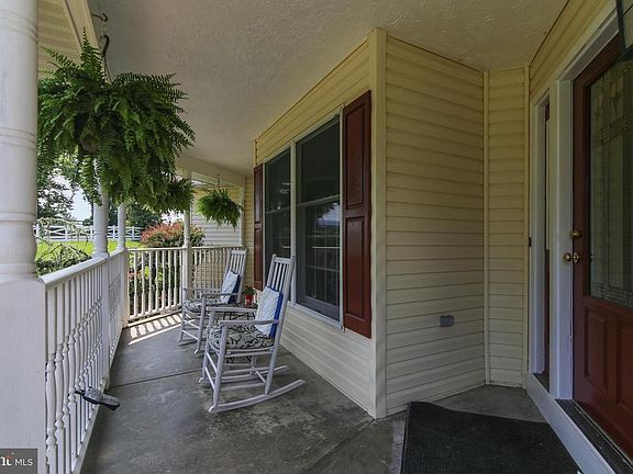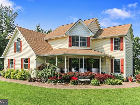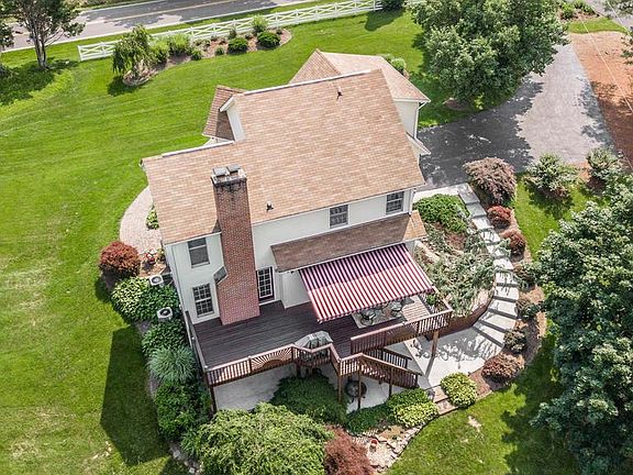 6.63 country acres with scenic vistas; partially wooded and backing to Middle Creek. Beautifully maintained home with front porch and many outdoor areas; huge eat-in kitchen opens to deck with retractable awning, walk-out lower level family room w/half bath opens to covered patio and offers potential for 4th BR; all new carpet 2nd fl bedrooms, new bath flooring, many updates means low maintenance