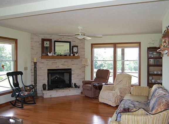 Take a look at this country ranch home! 3 bedrooms, 1 bath with 2 car attached garage. A separate detached building could be used as a workshop or host family gatherings. Limestone wood burning fireplace to keep you cozy during those cold days. Ample yard space for a garden and roof is 4 years old.