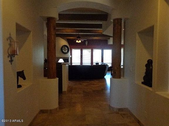 Luxury custom home on 1.1 acres irrigated horse property with Mountain views. Territorial style with a courtyard entry. Highly upgraded features with 10 and 12 foot ceilings, travertine flooring, granite counter tops, custom cabinets, stainless steel appliances, double oven, oil rubbed bronze faucets and hardware, plumbed for central vac, prewired surround sound, custom two tone paint, gas fireplace, wetbar. The master suite has a travertine snail shower, jet tub, large walk in closet and private exit to an extended covered patio. Blockwall enclosed backyard and horse set-up. Shared well has 3 homes.