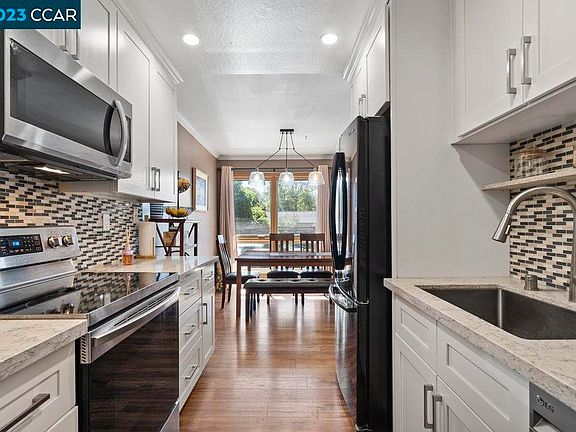 Fully renovated 3 bedroom home in the sought after Vintner community in San Ramon! This 1340 sqft model is one of the rarest floor plans in The Vintner and seldomly comes available. It includes 3 bedrooms, 2 bathrooms & features a bright, airy and open layout with separate family room, dining room and kitchen. Completely renovated in 2020, this one is truly turn-key! The gourmet kitchen includes custom shaker cabinets, tile backsplash, quartz countertops and stainless steel appliances… the living room is a great entertaining space highlighted by the tile fireplace & slider leading out to the spacious patio with extra storage. The huge primary suite offers his/hers closets and a chic bathroom with Moroccan-style tiling. Other updates include laminate flooring, recessed lighting and crown moulding throughout. Large windows bring in plenty of light! One of the best locations in the complex close to the carport, laundry facility, mailroom and pool. 3 parking spots - 1 covered carport and 2 uncovered spaces. HOA include 2 pools, sauna, gym, recreation room and green belt. Amazing location close to award winning schools, freeways, BART, shops, and parks.