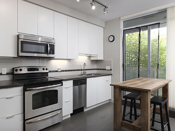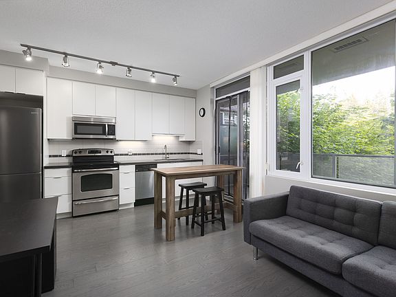 This listing is presented by Birds Nest Properties. Highland House 9025 Highland Court, Burnaby 3rd Floor Condo 1 Bedroom 1 Bathroom 1 Parking Stall 1 Storage Locker 472 sq ft Furnished Open-Concept In-Suite Laundry Balcony Great Location Steps to Transit Sorry, no pets. Welcome home to Highland House, situated in the sought-after SFU Campus. Featuring an open-concept floor plan, over-height ceilings, and floor-to-ceiling windows, this 472 sq ft unit is filled with natural light and offers gorgeous views of the tree-lined streets right outside your window. The contemporary living space opens up to the spacious balcony, providing a space to enjoy your morning coffee. The kitchen comes equipped with stainless steel appliances, quartz countertops, and ample cabinet and counter space, alongside a movable island/dining table perfect for use as extra cooking space. This condo comes with 1 parking space and 1 storage space. Welcome to UniverCity at SFU an ideal blend of nature and community living. This vibrant neighborhood offers direct access to beautiful parks and scenic trails, all just steps from your home and nestled within Burnaby Mountain Park. Take a day trip over to Burnaby Park, and relax at Burnaby Lake on a summer day, or explore the SFU campus for a variety of activities. UniverCity features a walkable village atmosphere where you can shop for the freshest produce and other essentials at Nesters Market, or grab a coffee before heading for classes. Transit is easily accessible all around campus, as well as the surrounding streets such as Clark Rd and Barnet Rd. Minimum 1yr lease required. Tenants pay for all utilities. No smoking.