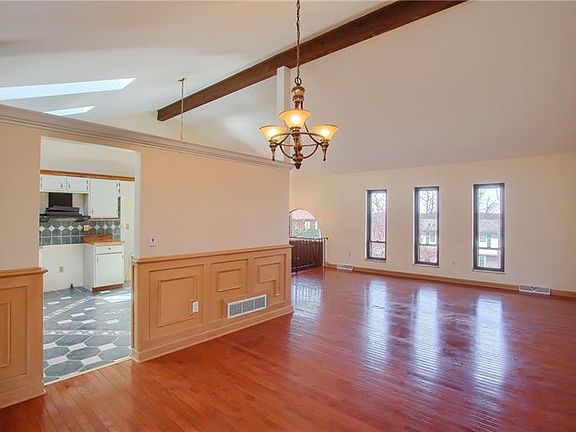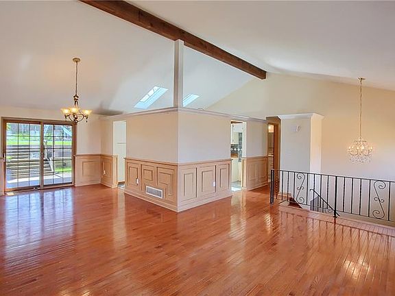 Vaulted ceiling and hardwood flooring enhance the open layout of the living & dining rooms. Enjoy meals with family in friends in the dining room where wainscoting adds a touch of elegance. New skylights in the kitchen provide abundant natural light creating a bright space to enjoy cooking. Sliding doors off the dining room lead to covered the rear patio, and back yard area. The in ground pool is ready to be filled & enjoyed! A new pump has been installed & the pool and deck area have been power washed. The large finished lower level boasts a brick fireplace and wet bar. The main bath has been completely remodeled. Additional updates include carpets all cleaned, new carpeting in master bedroom, ceilings & walls painted in most areas, new toilets in extra baths, kitchen tile cleaned & sealed. Both gas & electric connection available for stove.