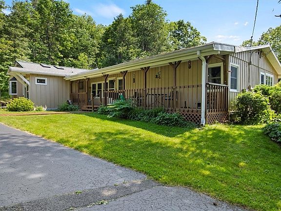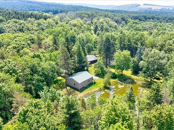 In my years in the Finger Lakes, this is one of the most beautiful properties that I've ever seen. Over 136 stunning acres covered with forests, fields, and rolling hills. Trails weave through the entire walkable property over streams and past hardwood and evergreen groves. Wildlife is everywhere.. perfection for an outdoor enthusiast. The 2,300+sqft home is bright and open, with nature views from every room. The updated kitchen has stainless appliances, and flows to an eat-in area and a slider to the back deck. A beautiful brick fireplace is the focal point of the large living room, and backs to the cozy TV room. There are 4 bedrooms, including a primary suite, office space with a skylight, and a huge addition currently used as an artists studio. An ultra-efficient geothermal system [2016] heats and cools the home, with loads of other mechanical updates. The enormous 32'x40' barn has plenty of room for storage and toys, along with a detached garage with a loft and woodburning stove. 2 ponds grace the property, with gorgeous views from the house. Don't miss this chance to own this incredibly special property.