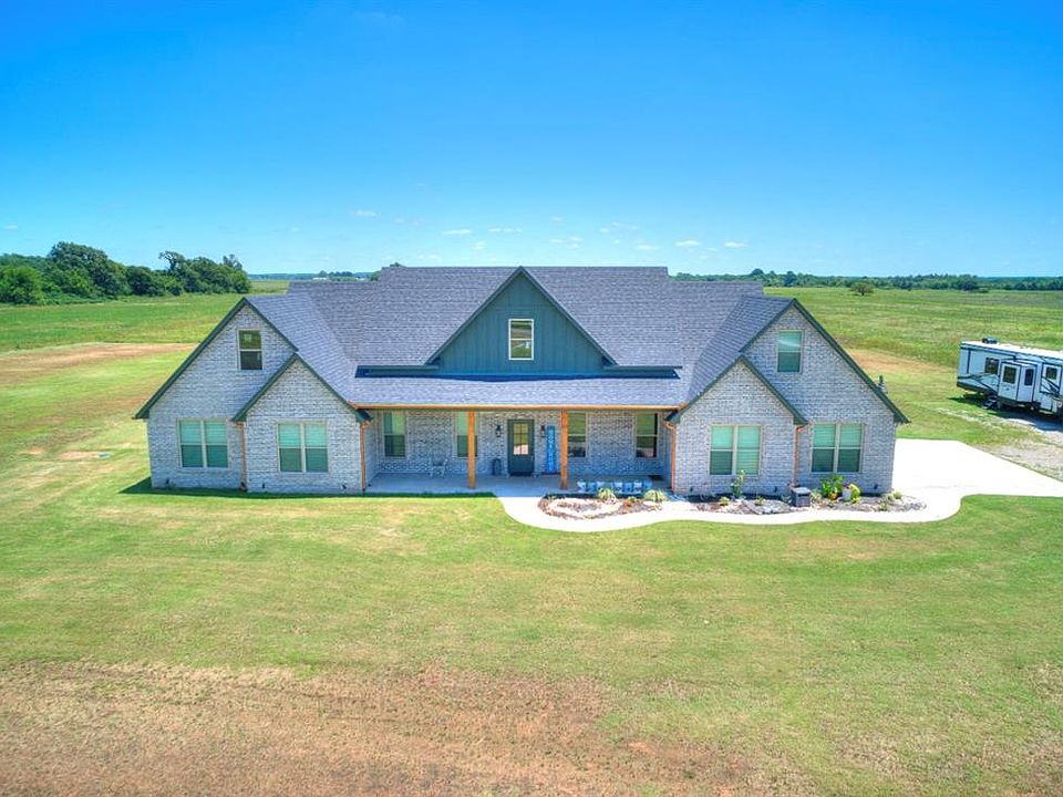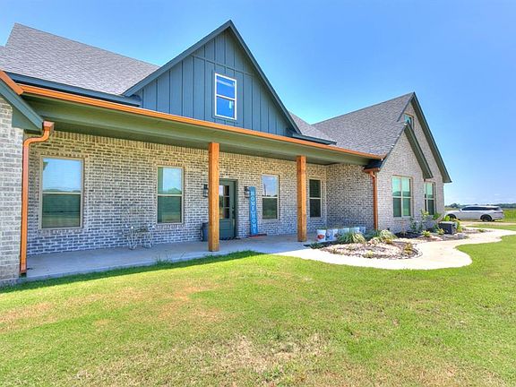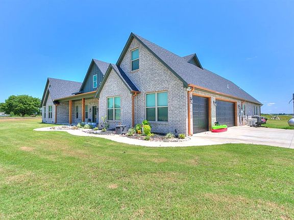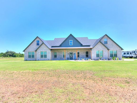 Prepare to fall in love as you walk into this like new, 3710 sq ft home situated on 8.75 acres in Prague. This property layout is easy to improve. Put in a workshop, an outdoor entertainment area or farm your land. The opportunities are endless with this open meadow set up. Interior property features include but are not limited to 4 or 5 bedrooms, 4 baths, 2 living areas, play room with backyard access, an office, large kitchen with island seating, chiseled edged, leathered granite, brick floors, custom window overlooking back yard, formal dining room, soaring ceilings, oversized bedrooms, tiled tub surrounds, upgraded woodwork throughout with exposed beam in main living area, built-in dog room with garage access, full on dog wash and hidden wet bar space! There are two ADA compliant master bedroom suite options and the upstairs bonus space has a full bath and closet. Master bedroom has a black, custom soaker tub, large, walk in shower, double vanities and access to laundry through walk-in closet which also leads to mud room and garage. Oversized garage offers 7.5 ft tall overhead doors and Generac generator system which stays with home, 2 Ac units with built-in humidifiers, fiber optic internet availability and is setup on rural water, propane for gas stove only and septic system. It's hard not to do a double take when driving by as this home offers great curb appeal. Stand out copper guttering and covered front and back patios. East facing back porch and west facing front covered patio offer the best of both worlds as you soak in the stellar Oklahoma sunsets and sunrises. No expenses have been spared on this one of a kind, custom charmer. Pro Images are on the way! Set up a private showing today!