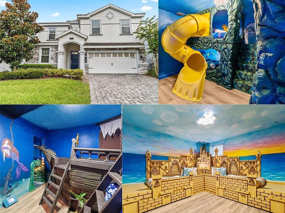 TURN KEY RENTAL HOME!! Feast your eyes on this FULLY FURNISHED 8-bedroom Maui floorplan in beautiful Champions Gate! Tastefully decorated and well maintained by current owners, this home has been fully optimized to standout in the rental market with multiple THEMED ROOMS of all the favorites such as CUSTOM SANDCASTLE BUNK BED MOANA THEMED ROOM WITH PULL OUT TRUNDLE BEDS. A CUSTOM FINDING NEMO THEMED BEDROOM WITH A SLIDE! Don’t miss this rooms SECRET PASSAGEWAY that leads to a UNDER THE SEA THEMED ROOM with a CUSTOM BUNK BEDS INCLUDING A PIRATE SHIP WITH A HIDDEN TREASURE! This room even has UNDERWATER LIGHTING EFFECTS to complete the FULL EMERSIVE EXPERIENCE! Guest will love the LITTLE MERMAID THEMED GARAGE with amenities such as an AIR HOCKEY TABLE, DESIGNATED GAMING AREA, SKEEBALL TABLE & PING PONG! The garage also has a mini split AC unit mounted on the wall which allows for the room to be used during the hotter months of the year! This home also has a PRIVATE MOVIE THEATER upstairs that is perfect for wrapping up long days at the parks with the loved ones! This home really has something for everyone and should hit the ground running from a rental standpoint! THEMED UP homes like this one are rare! Take advantage of this truly TURN KEY opportunity and schedule your showing today! Champions Gate checks every box from an amenity standpoint with a multimillion-dollar community pool/clubhouse, lazy river, indoor cabanas with AC, arcade, fitness center, Champions Gate Country Club golf course, full-service restaurant, beach volleyball courts, onsite movie theater, & of course the Tiki Bar at the pool to cool down with a refreshing drink and meet new friends! Champions gate is in an excellent location being only a 15-minute drive to Disney Parks and close proximity to plenty of restaurants, theme parks, highways, & shopping. This fully furnished home is truly TURNKEY as the association takes care of all the general maintenance of the exterior. This home has been geared up to be a standout in the short-term rental market! Don't miss your chance!! Make this you primary, second home, or investment property & start making family memories today!!