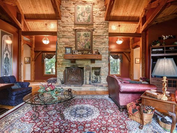 WOW!!! You've never seen a house like this! It's an awe inspiring TIMBER FRAME home, not to confused with a log cabin. Soaring Ceiling Greets you as you step inside this tremendous home. A fireplace is a large focal point that climbs the entire way into the tall ceiling! A GOURMET KITCHEN sits adjacent to the Vaulted Great room with stainless designer appliances and granite countertops. 2 laundry rooms, one in each wing. There's a generous deck, a shared POND and a 2nd 2 car garage with a 1,000 sq ft. MOTHER-IN-LAW'S QUARTERS that sits on 5 1/2 manicured acres!