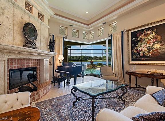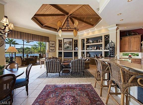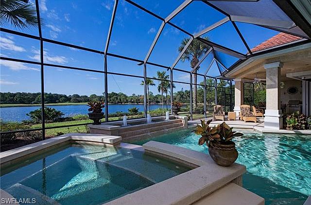 H.8712 - Awesome lake views with golf course as a back drop and south-to-west rear exposure for glorious sunsets await at this award winning London Bay home. The classic design with spacious, open living areas and disappearing sliding glass doors flows seamlessly inside and out. The sun-filled poolscape shines by night framed by lush foliage with accent lighting. You will find the gourmet kitchen complete with gas range, double ovens, large island & oversized walk-in pantry to be the heart of the home, and the sweeping lake vistas beyond the wrap around granite topped counter seating the icing on the cake! A highlight is the study featuring beautiful wood flooring, custom library built-ins and bay windows that capture natural light & tropical flora in abundance. From a grand fireplace, wet bar, and poolside kitchen to stone floors and striking ceiling treatments, appointments are luxurious indeed. The double car garage offers a separate golf cart bay as well as air-conditioned storage. Enjoy the intimate lifestyle at this Audubon Sanctuary country club where the sandy beach shores are just a breeze away as are some of Naples' best dining, shopping, cultural & entertainment venues.