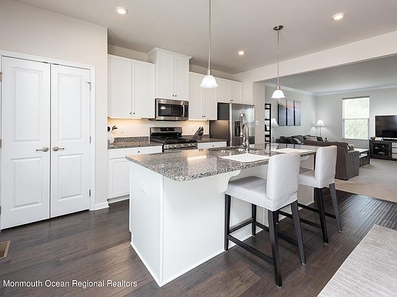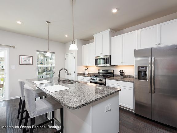 Welcome Home to this beautiful tri-level townhome that is a Commuter's Dream! Lower level offers roomy family room/den area, half bath with direct entry into the two car garage. Head up to the second floor to an open floor concept. Kitchen boasts white cabinets, large center island, granite countertops and stainless steel appliances with dining room area & sliding doors that opens to a quaint deck area, large living room w/crown molding also located on second floor. Upper level has primary suite w/9 foot tray ceiling, walk-in closet & full bath w/double vanity. Two additional bedrooms, full bath & laundry room complete this beautiful home! Access to boardwalk, beach, park & playground. Close to all, major highways, train, downtown shops and restaurants and the Jersey Shore. FERRY to New York City COMING SOON!! This is one of New Jersey's fastest growing communities! OPEN HOUSE CANCELLED TODAY 6/18