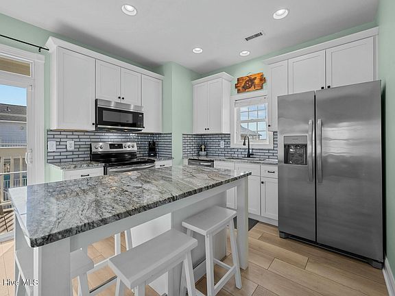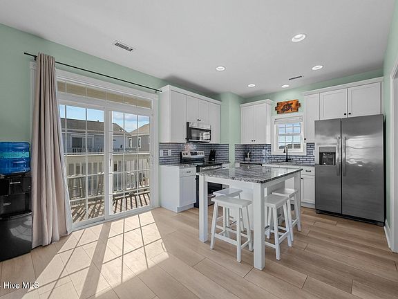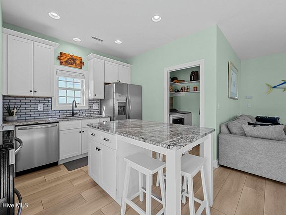 The upper level is the heart of the home, featuring an open-concept living area with 9-foot ceilings that are flooded with natural light from elegantly trimmed 3 1/4-inch windows adorned with 2-inch faux wood blinds. The kitchen is a culinary delight, showcasing a single-basin stainless steel sink with a Moen faucet, stainless steel appliances include a 5-burner flat-top Frigidaire Gallery stove, gleaming granite countertops topped with a chic glass-tiled backsplash, and a spacious 3-foot by 5-foot eat-in island. Storage abounds with 42-inch cabinets, while the eat-in breakfast bar and ocean-facing deck provide ideal spaces for hosting guests.