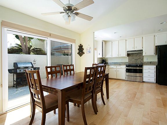 Exquisite Southern California Coastal Living. Enter this beautiful end unit through private walkway that leads to large deck. Kitchen and Dining areas are open, flowing graciously to one another with beautiful wood floors that span the space creating a warm and inviting feel. Kitchen features an open spacious design with beautiful white cabinets, granite counters & plentiful cabinets. Large patio is just a few steps off the kitchen creating the ideal space for alfresco dining or lounging. See supplement