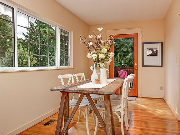 Charming, remodeled bungalow. Open, light, spacious living room and dining room with gleaming hardwood floors and mantel fireplace. Inviting deck for entertaining. Updated kitchen with slate flooring, overlooking back yard. Generous master bedroom with vaulted ceiling and good size closet. Lovely hardwood floors in both bedrooms. Attractive landscaped yard. Easy access to restaurants, shopping, parks and downtown. A gem!