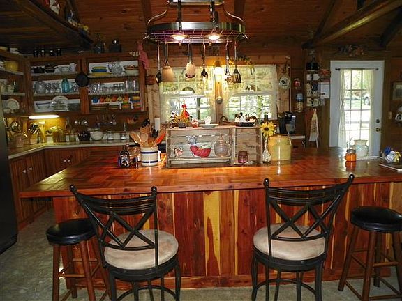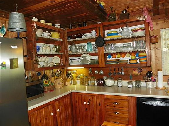 Rustic Style Log Cabin with acreage borders Mark Twain National Forest & Beaver Creek. Features Great Room with fireplace & open floor plan,walk-out basement with workshop and amazing views. Newer doors & windows & HVAC, Dual Fuel Nordyne Split System furnace uses electric & propane. Covered Porch and Covered deck, rail-fenced yard, and mature landscaping add to the appeal. Beaver Creek runs through the property and also has frontage. 6 acres of pasture has road frontage; great place to keep horses.