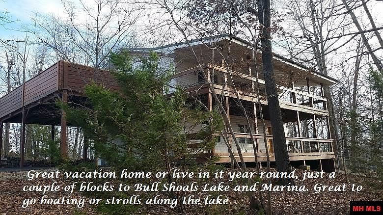NICELY UPDATED HOME READY TO MOVE IN. USE AS A VACATION HOME OR YEAR ROUND RESIDENCE. HAS SEASONAL VIEW OF BULL SHOALS LAKE AND MARINA AND LAKE ACCESS JUST 1 MINUTE AWAY. BEAUTIFUL CABINETS, NEW COUNTERTOPS AND WAIT TILL YOU SEE THE HICKORY FLOORS! MASTER BATH HAS BEAUTIFUL STONE SINK & PEBBLED ROCK SHOWER. FREE STANDING WOOD STOVE IN LIVING ROOM, VERY SPACIOUS COVERED DECK. ENJOY NATURE & GRILLING. FINISHED LOWER LEVEL AND SET UP FOR 2ND MASTER BR & BATH. LAUNDRY HOOKUPS ON EACH LEVEL, 1 CAR H/C GARAGE.