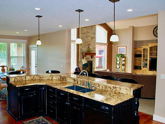 Ranch Style, Home office, Surround sound family room, Office, Master bedroom and outside covered deck. Huge rooms, Central vac up and down, Security system, Water softener (own), Mud room W/custom cabinets. 8' foot doors, Wide moldings throughout, Three tone paint up and down, Built in entertainment center upstairs family room, Built in hutch in kitchen, Granite counters, Custom cabinets in Kitchen, Laundry room (also has a sink), Main bathroom, Beautiful custom vanities( 5) in bathrooms, Ceiling fans, Huge windows, Custom blinds throughout, Tray ceiling in master bedroom, Walk out to huge composite deck W/railing all the way around , Walk out to deck from master bedroom (uncovered) and Walk out to (covered) deck from kitchen., Walkout basement, Jack & Jill bathrooms down stairs, Theater room possible, Hugh bonus room, 16' foot ceilings in family room, vaulted ceilings in most rooms, Huge storage room down stairs, Professionally landscaped, Walk in closets, Jacuzzi tub, duel shower, 2 sinks in master bedroom, Can lighting throughout, 3 gas fire places all beautifully rocked one in living room goes clear to 16' ceilings, Cold Storage, 4 Car attached garage, So many more extras! NO REALATORS, SERIOUS BUYERS ONLY, MUST BE PREAPPROVED (Letter) UNLESS CASH OFFER, WON'T FIND ANOTHER LIKE THIS!