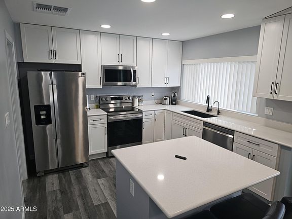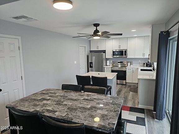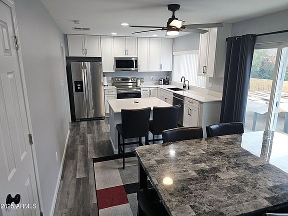 NEW EVERYTHING! Quality work in AZ? It IS possible, & this stunning home has it. 4 Bed, 2 Bath, w/ fireplace. Roof & ENTIRE HVAC system replaced January 2025. New 50 gal. Wi-Fi water heater. Flat walls, stone tops & Moen faucets throughout, stainless appliances, new floors & trim, new windows & doors, lights & fans. Clean and EFFICIENT! Free TV w/ powered attic antenna. 8 camera CCTV surveillance system w/ safe locked DVR. 4 car driveway, RV / trailer storage, 2.5 car garage / shop w/ cabinets & granite counters, 120 sq. ft. finished shed. 2 miles from both I60 & I101. Washer/dryer, wall mounted TVs, window coverings, & fireplace accessories included. Great lot w/ two full grown palm trees & real grass!! Photos update as work completes. Exterior being painted. NO HOA!! HOME WARRANTY!