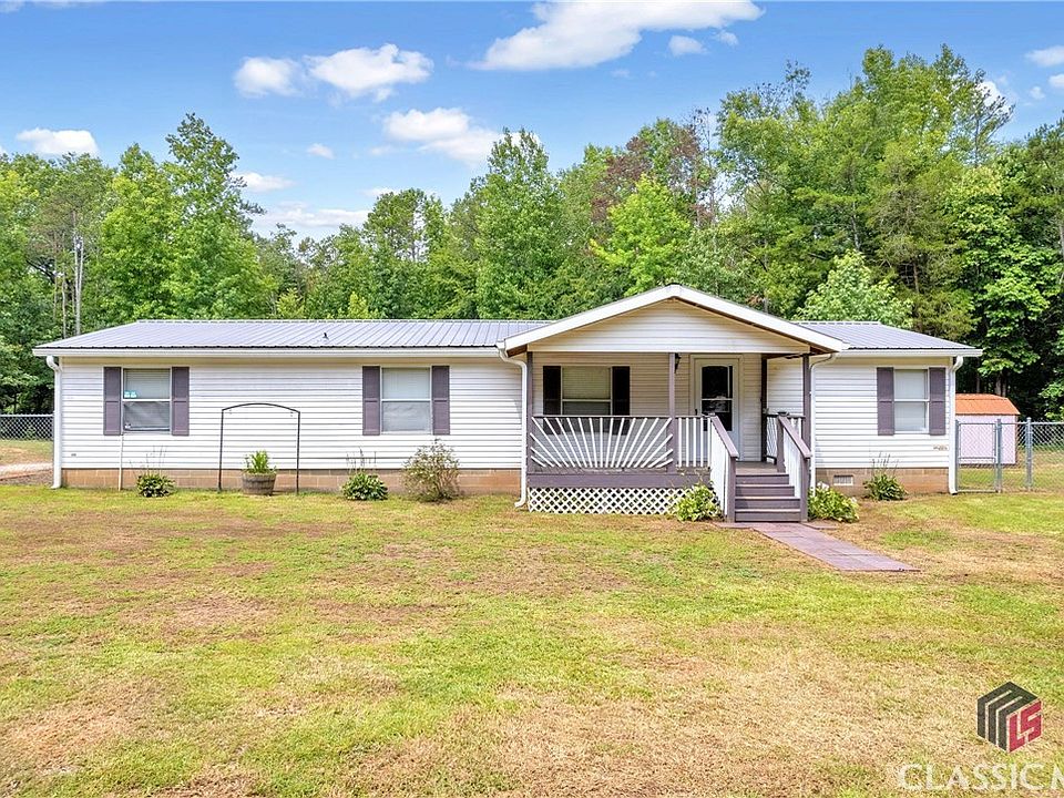 A charming country home with three bedrooms, two baths, resting on just over 3.6 acres of land. This property includes a covered outdoor carport, two storage sheds, a fenced yard, and a large covered front porch. Enter to a cozy living room with updated flooring. Each of the three bedrooms offer natural light, creating a warm and inviting atmosphere. The master suite includes a private ensuite bath. Outside, the expansive yard provides endless opportunities for gardening, entertaining, or simply enjoying the tranquility of nature. The covered front porch is the perfect spot for morning coffee or evening sunsets, offering a peaceful retreat from the hustle and bustle of daily life. With its combination of comfort, convenience, and space, this home is truly a hidden gem waiting to be cherished by its next owners.