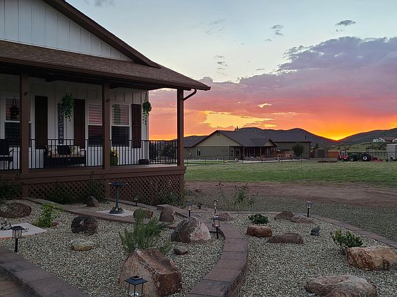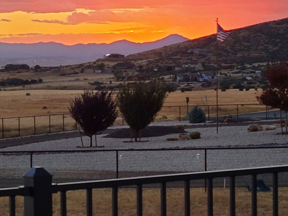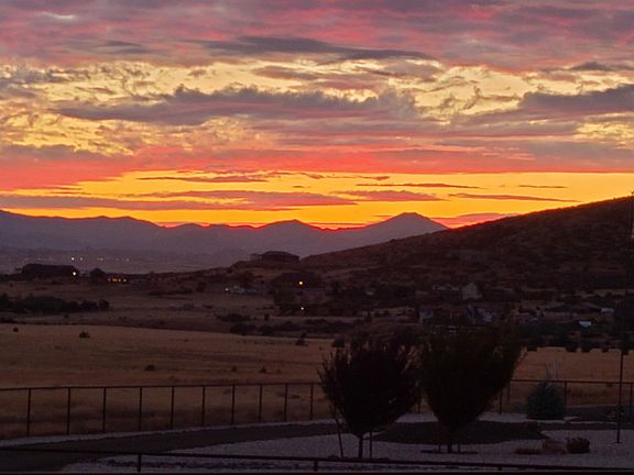 Built in 2022, and completed in 2023, this stunning 3-bedroom, 2-bathroom contemporary home offers 1,930 sq ft of well-designed living space on 2 acres of fully fenced property with pipe-and-no-climb fencing and an electric gated entry. Backing directly to State Land, the home offers privacy, open views, and immediate access to Arizona's natural beauty. From the expansive back deck, enjoy sweeping views of the Prescott Valley city lights, plus spectacular July 4th fireworks at night--perfect for relaxing or entertaining.The exterior highlights low-maintenance living with a paver driveway and walkways, landscaped perimeter with solar lighting, and both a 35' x 8' front deck and a 55' x 20' rear deck. The back deck, accessible from the kitchen, master suite, and second bedroom, includes maintenance-free decking with iron rails, a propane bib for grilling, and beautiful views. Other outdoor features include solar-lit stairs to the backyard, a walk-in crawl space spanning the full size of the home (4'-7' height), hose bibs on three sides plus in the garage, and a spacious 3-car garage with 10' ceilings, 9' doors, and smart Lift-Master openers with cameras.Inside, 10' ceilings throughout and a vaulted great room create an airy feel. The chef's kitchen offers a 5' x 8' center island with cabinetry on both sides, quartz countertops, 42'' custom soft-close cabinets, under-cabinet lighting, GE Profile smart appliances, farmhouse sink with touch faucet, and a 5-filter R/O system plumbed to the refrigerator.The master suite features a large walk-in closet, walk-in shower with bench, dual vanities, inset medicine cabinet mirrors, and private deck access. A second full bathroom also offers a walk-in shower. Upgrades include 8' doors, custom gas fireplace with remote, ceiling fans in all bedrooms and great room, plantation shutters, and window treatments throughout, Schlage smart lock, and Honeywell smart thermostat.Practical features add comfort and efficiency: spray foam attic insulation, whole-house water filtration, water softener, electric 50-gallon water heater with circulating pump for instant hot water, EV charger, and ethernet wiring to TVs and the office. The laundry room includes storage cabinets, closet space, GE Profile washer/dryer on pedestals, and exterior access.With modern design, smart technology, energy efficiency, and a peaceful setting backing to State Land, this home is move-in ready and meticulously maintained. Upon installation of well, it was reported on well driller's report to be getting 30 GPM! A rare opportunity for those seeking quality, privacy, and Arizona living at its finest.