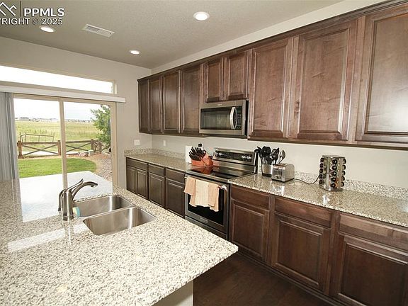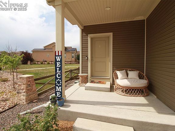 Welcome home to this stunning, like-new two-story gem in the highly desirable Banning Lewis Ranch community! This move-in-ready beauty is filled with natural light and offers the perfect blend of style, comfort, and convenience. The kitchen is a showstopper with gleaming granite countertops, a spacious center island, stainless steel appliances, and 42-inch cabinets with crown molding—providing ample storage and a polished, upscale feel. The open-concept layout flows seamlessly into a bright and airy living room, making it ideal for both everyday living and entertaining. Upstairs, you'll find a spacious primary suite complete with a large walk-in closet and a luxurious en-suite bathroom featuring a double vanity and an oversized walk-in shower. Two additional generously sized bedrooms are located nearby—perfect for guests, family, or your home office. Step outside and enjoy the oversized concrete patio—perfect for relaxing, dining, or hosting gatherings. The fully fenced backyard backs to open space, giving you wide-open views and a rare sense of privacy. The low monthly HOA fee covers access to top-notch amenities including a 24-hour fitness center, indoor and outdoor pools, trash and recycling, a dog park, and year-round community events that make Banning Lewis Ranch feel like a true neighborhood. Don’t miss your chance to call this beautiful home yours—it’s everything you’ve been looking for and more!