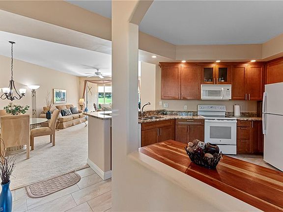 Welcome to this beautifully updated ground floor turnkey condo offering 1,209 square feet of living space with 2 bedrooms and 2 bathrooms. Designed for comfort and convenience, this residence features a gorgeous kitchen with new solid maple cabinets from Kitchens by Ambiance, abundant storage and counter space, granite countertops from Marbleworks, and a breakfast bar ideal for casual dining. The flooring throughout combines elegance and durability with 12x24 porcelain tile by Energieker and plush Karastan carpeting from Taylor Carpet One. Window blinds by Hunter Douglas add a refined finishing touch, while all baseboards have been replaced with 6” baseboards for a fresh, modern look. The spacious living area flows seamlessly to the screened lanai through a triple-pane slider door, offering tranquil views of the golf course with desirable southeast rear exposure. The lanai is enhanced with motorized shades from SunCoast Blinds that provide privacy while still allowing you to see out, creating the perfect retreat to relax and unwind. Additional features include a roof, gutters, and downspouts that are just three years new, ensuring peace of mind. Every detail in this home has been thoughtfully selected to create a move-in-ready space, blending quality craftsmanship with stylish upgrades. This property is perfectly situated just a short two-minute walk to the community pool and only five minutes to the newly renovated clubhouse, restaurant, and bar. Both the clubhouse and golf course were beautifully redone in 2023, adding to the appeal of this active lifestyle community. The surrounding area offers endless dining, shopping, and entertainment options to enjoy year-round. And when it’s time for the beach, you’ll be just a 15–20 minute drive from the pristine sands of Bonita Beach. This is truly paradise at your fingertips!