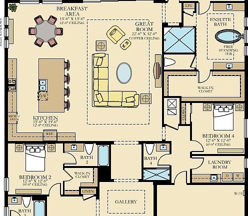 This luxe single-story home features an impressive central gallery that leads into an open layout among the Great Room with elegant coffered ceilings and gourmet kitchen. Through sliding glass doors is a covered terrace ideal for outdoor activities. In addition to the owner's suite with a spa-style bathroom, there are three bedrooms, two of which boast private en-suite bathrooms.