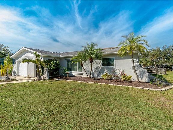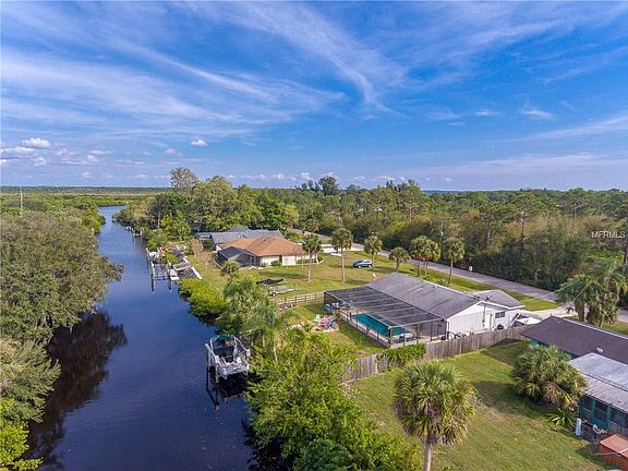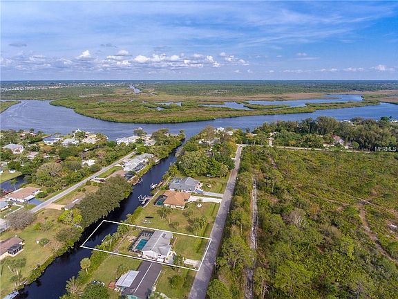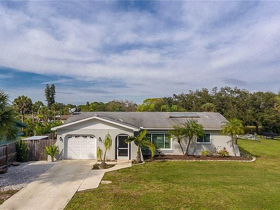 This amazing Waterfront Home is located across from the Myakka River Forest only 6 doors from the Myakka River. You will delight in your neighbors who include mischievous rabbits, turtles, fish, manatees, dolphins, and beautiful birds! Your elegant leaded glass paned front door opens to a decorator's dream where walls are tastefully painted, lighting fixtures are pieces of art, and attractive tile flooring and wood laminate flooring lead you through this upgraded home. Numerous newer windows create an energizing flow of natural light, while sliding glass doors frame your magnificent water views, just past your screened lanai and sparkling pool. The crown molding, chair rail, and wainscoting create the feel of a classic beach cottage, and the bathrooms are stylishly upgraded. The split floor plan gives you privacy from your guests, and the kitchen features a breakfast bar, beautiful wood cabinets, newer stainless appliances, all accented with an amazing glass tile backsplash. Have breakfast in the dining nook while you plan your day. Should you splash your boat from its lift and be on the Myakka River in seconds, where the abundant Red Fish, Tarpon, Snook, & Trout are waiting for you? Kayak the waterway? Or relax in your retreat, enjoying your pool and the views and sounds that only nature can provide in your fenced backyard. A Brand-New HVAC System, Hurricane Shutters, a newer well and water system, newer wiring, and kitchen R/O provide extra peace of mind! Do not miss your happily ever after!
