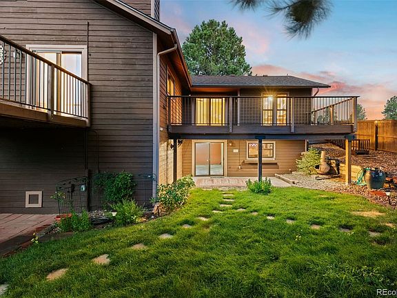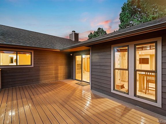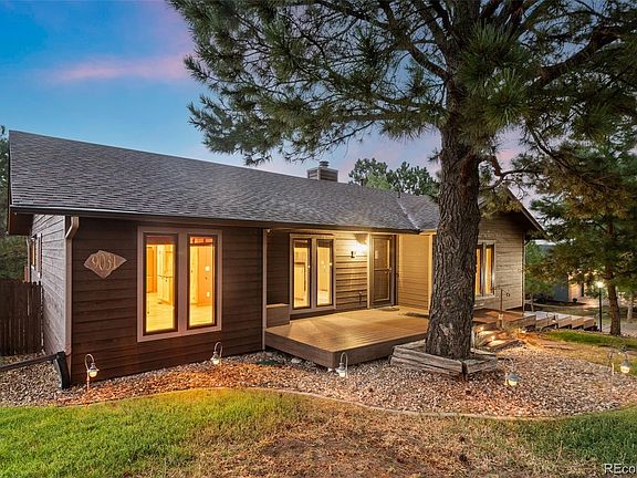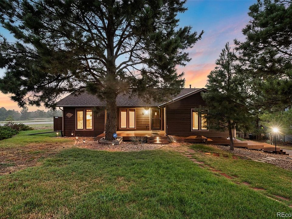 Nestled in Deep in the Pinery, this stunning 4-bedroom, 3-bathroom home offers incredible views of sunsets and has the perfect blend of comfort and style. Inside you're greeted with natural light enhanced by updated and upsized windows. Make your way into the stunning remodeled kitchen that was done with precision workmanship. Custom hand-made cabinets crafted from Ponderosa Pine Beetle Kill harvested in Westcliff, CO provide ample storage and bring the outdoors inside. Exotic Brazilian Granite counter tops complement the cabinets. A top of the line Thermador range is a showcase for the kitchen! Careful placement of a picture window allows for panoramic sunsets to be seen while cooking. Intentional thought was put into the open concept layout to allow for the sweet aroma's, and conversations of the kitchen to flow effortlessly throughout the home. The front living room has been used for casual living while the rear living room for formal entertaining. An oversized deck showcases expansive views of the front range. Filling out the main floor, a luxurious master suite with private balcony awaits. With a private fireplace, large closet and en-suite bathroom with soaking tub, your oasis awaits! Two additional guest bedrooms and a full hall bathroom offer plenty of space for family or guests. The finished basement is a true highlight, boasting a country wet bar and ample space for a home theater, game room, or additional living area. An additional bedroom, powder bathroom, laundry and "bonus room" can also be found downstairs.