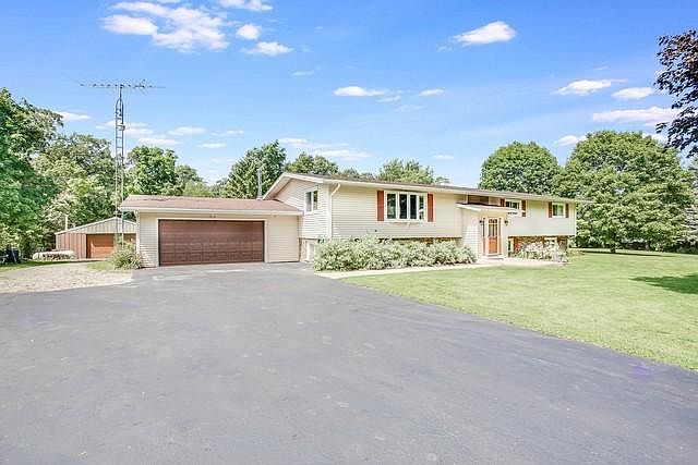Salem 5.05 acres, spacious raised ranch/bi-level home with many updates: remodeled kitchen and main bathroom,much flooring, roof,furnace,air conditioner,windows,siding(vinyl),hot water tank,expanded asphalt driveway. Walkout/daylight lower level with 4th bedroom, full bath, second kitchen, and giant family room. Attached 24'x24' garage PLUS 30'x45' Wick building now used as hobby barn. BIG plus is municipal sewer service; and 236th AVE is ''no outlet'' road with light use. Heavily wooded (mostly hickory and oak trees; maple, evergreen, etc.)private setting with winding stream and tiny pond for water retention and wildlife. Enjoy spectacular sunrises and sunset as home has east/west exposure.