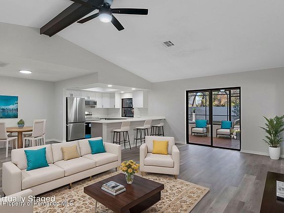 Completely Updated 3 Bedroom, 2 Bathroom Home With A 2-Car Garage And A Stunning Outdoor Oasis! Over 2300sf under roof! This Beautifully Renovated Home Features A Large, Sparkling Pool With A Screened-In Lanai—Perfect For Relaxing Or Entertaining. The Pool Boasts A Waterfall Feature, Grand Staircase-Style Steps, An 8-Foot Depth, A Built-In Sitting Area, A Light, And A Freshly Painted Finish. Inside, The Kitchen Showcases Brand-New Stainless Steel Appliances, Quartz Countertops, Bar Seating, And Wood Cabinets With Soft-Close Drawers, All Flowing Seamlessly Into The Open Floor Plan With Vaulted Ceilings And Recessed Lighting. Luxury Vinyl Plank Flooring Runs Throughout The Home, Adding Both Style And Durability. The Spacious Primary Bedroom Offers An En Suite Bath With Modern Fixtures And A Walk-In Closet, While Sliding Glass Doors Lead To A Massive 10x35 Tiled Florida Room Featuring Outdoor Fans And A Bar Shelf—Extending Your Living Space Out To The Pool. Additional Highlights Include A Freshly Painted Interior & Exterior, An Inside Laundry Room, A Utility Sink In The Garage, Double Pane Windows, And Gutters. The Yard Includes A Shed For Extra Storage, Providing Plenty Of Room For Your Outdoor Toys. Minutes To Shopping And Restaurants! This Home Has It All—Don't Miss Out On This Florida Dream!
