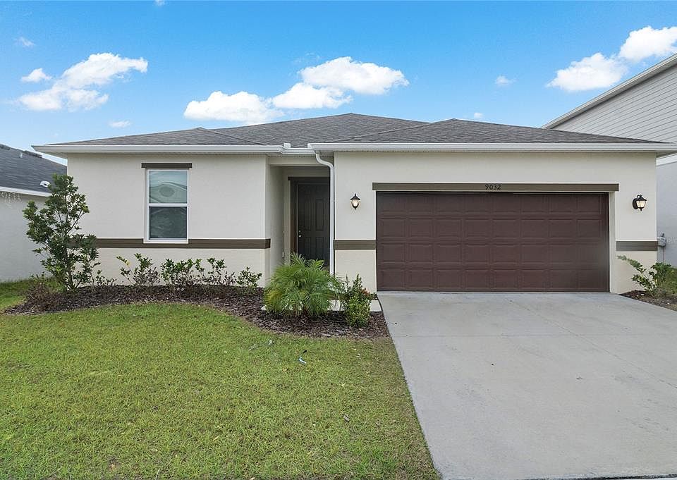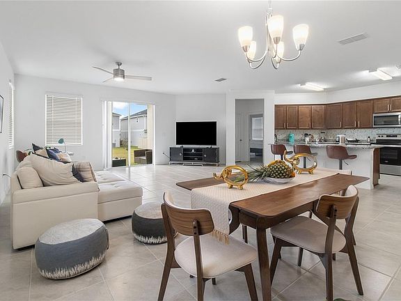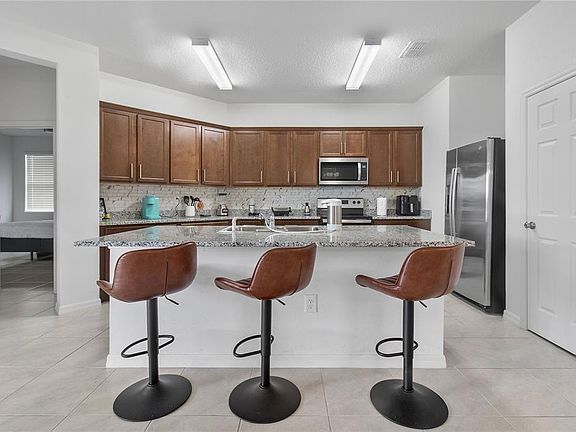 Beautiful home in a new community near Disney theme parks, close to restaurants, shops, supermarkets, and top-rated schools—perfect for familiesThis. This home offers a popular design and is sure to impress with its 9-foot ceilings and high-quality tile floors. Near the entryway are four bedrooms, two bathrooms with dual-sink vanities, and a family room. The entry leads to an open kitchen overlooking a spacious living room. The kitchen features 36-inch walnut upper cabinets with crown molding, granite countertops, an island, a chrome Moen faucet, a Kohler stainless steel sink, and Whirlpool stainless steel appliances. Adjacent to the living room, the master bedroom features a walk-in closet and an ensuite bathroom with a dual-sink vanity..