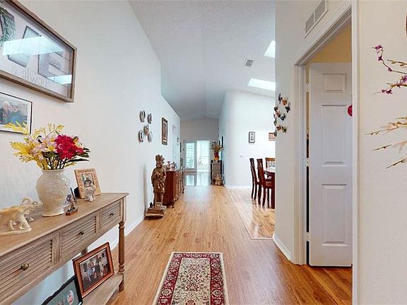 FENCED PRIVATE COURTYARD, VAULTED CEILINGS, and LOTS OF NATURAL LIGHT THROUGHOUT. This very spacious Jefferson model courtyard home is located in the much sought after gated 55+ golf community of On Top of the World. To fully appreciate the residence, make sure you view the 3D Virtual tour. Home features 3 bedrooms, 2 baths, 2-car garage, updated 3-season glass enclosed Lanai, split bedroom floor plan, newer roof (2015), newer HVAC (2014), vaulted ceilings throughout, 2 skylights, Solar tube in Kitchen, private courtyard, inside Laundry, utility sink, and more. Lawn care, 24-hour guarded gate, basic cable, gym, exercise classes, exterior painting, and more are included in your monthly HOA fee. Enter the foyer to view vaulted ceilings throughout the home. Continue down the main hall to find a spacious dining room which features 2 skylights. Opposite the dining room and to your left is the eat-in kitchen which features a large pantry, and informal dining area with direct access to your private courtyard. Continue forward and the main hall opens to the spacious living room with French doors that open to the 3-season Lanai. The very generously sized Master Bedroom Suite is located at the back right of the home. Master Bedroom Suite features a HUGE walk-in closet, and Master Bath with extended vanity, and separate shower/toilet room with updated step-in shower.
