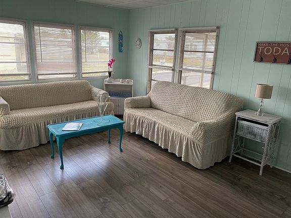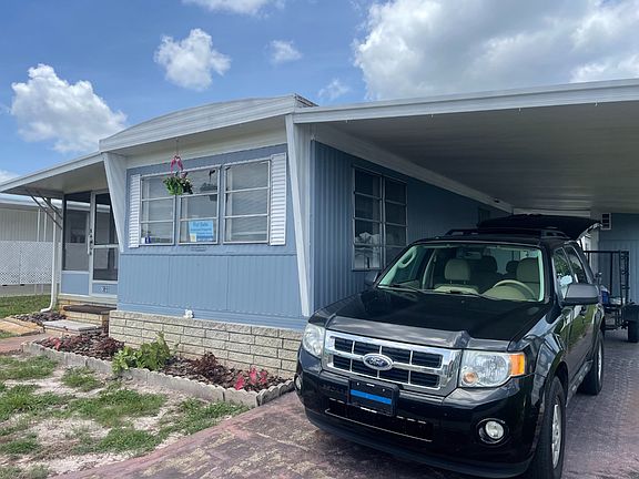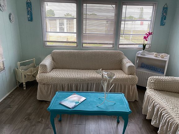 Great for a Florida getaway or your permanent home! Very shabby chic. New flooring, paint, blinds, kitchen counter, shower, toilet. Lots of windows for natural light. Kitchen has eat-in space. Central a/c. Carport has shed with room for a stackable washer/dryer. Furnished. Lot rent is approx. $580 per month includes water, trash, sewer and lawncare. Community is 55+ and has pool, clubhouse and shuffleboard.