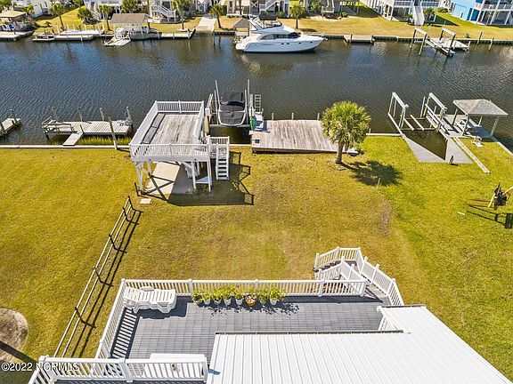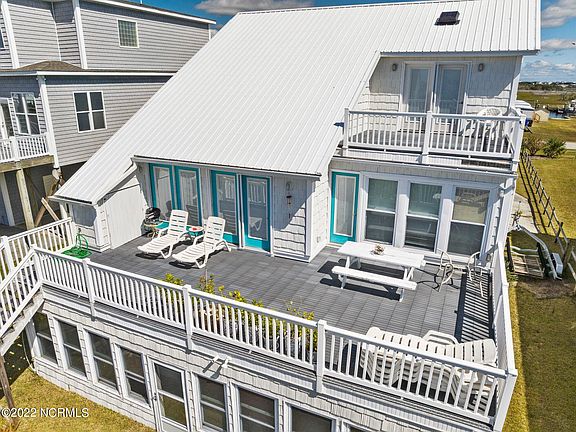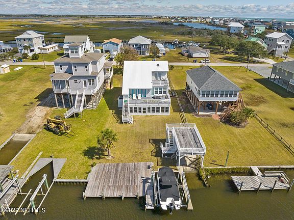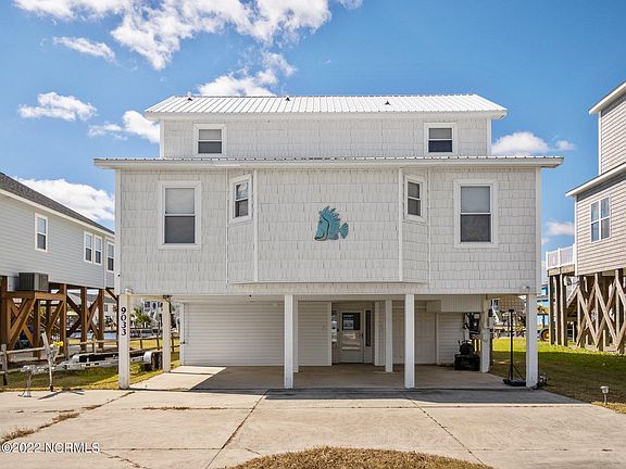 Welcome to 9033 9th Street on the highly desired canal streets of Surf City, conveniently located near local shops and restaurants, walking distance to Topsail Island's award-winning beaches, and offering deep water access with boat dock, boat lift, and private boat ramp. Recently renovated, this home greets you with a coastal white cedar-pressed vinyl shake, metal roof, and tastefully designed floorplan. Your first-floor host open-concept Living Area boasting smooth vaulted ceilings flooded with natural light from a pair of 6-foot French doors, expansive kitchen featuring granite countertops, dual basin stainless steel sink, ample storage in cabinetry and solid wood shelved pantry, 4-burner Kenmore stove, and 3-door stainless steel GE refrigerator. Entertain guests at your 8+ foot eat-in breakfast bar, recessed lit dining area, or take the party to your canal side decking perfect for viewing Topsail Island's notorious sunsets. Retire to your Master Bedroom with ensuite and attached water facing office/sitting area with private deck access. On the Main Level you will also find two guest bedrooms with vaulted ceilings, full guest bathroom, and laundry area. Upstairs hosts two more bedrooms with Jack and Jill set up, full bath with dual vanity boasting Moen fixtures, glass framed, 6-inch subway tiled trim shower, and access to upper-level canal facing deck. Additional features of the home include ground level second kitchen fully equipped with stainless steel sink, wiring for stove, tiled countertops and flooring, ground level half bathroom, ground level conditioned space for dining or game room, a nearly 500 square foot sunroom, boat dock, boat lift, boat ramp covered with elevated sun deck, covered carport with electric car charging station, gutters, outside hot and cold shower, and much more!