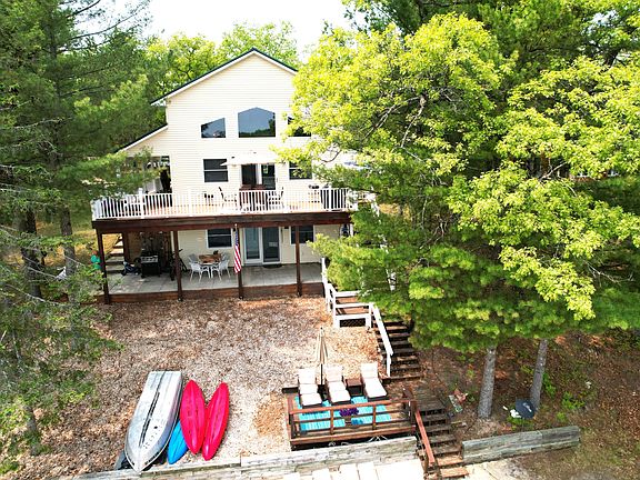 Magnificent, 4 bedroom, 3 bath waterfront lake home, filled with natural light on a well-maintained acre on Gifford Lake in Baldwin! This property boasts cathedral ceilings, multiple living spaces, a walkout lower level, large upper & lower decks, and a fire pit that leads to a pristine, 88 ft of frontage on a sandy beach. Included in the sale is the dock, a paddle boat, 3 kayaks & 2 small fishing boats! Looking for a turn key property? f Most furniture can be included as well. Enjoy all that Lake County has to offer! 1 mile directly north of Big Star Lake & just minutes to town.