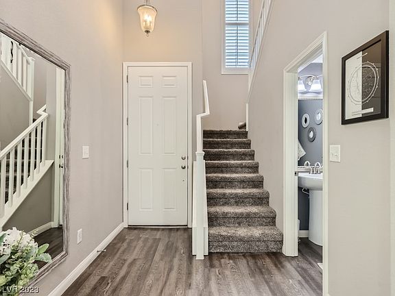 This beautiful 4 bedroom 2.5 bath 2 story home boasts pride of ownership from the original owners. It has plantation shutters on windows and sliding glass door, luxury vinyl flooring downstairs, in primary bed and bath and all wet areas, with upgraded carpeting in other rooms. Kitchen has gas range cooktop and double ovens. The AC unit and water heater are newly replaced, and includes a salt water softening system. Prime southwest location convenient to lots of shopping, just minutes to strip, airport, Allegiant Stadium, 15 and 215 Beltway. It's a must see!