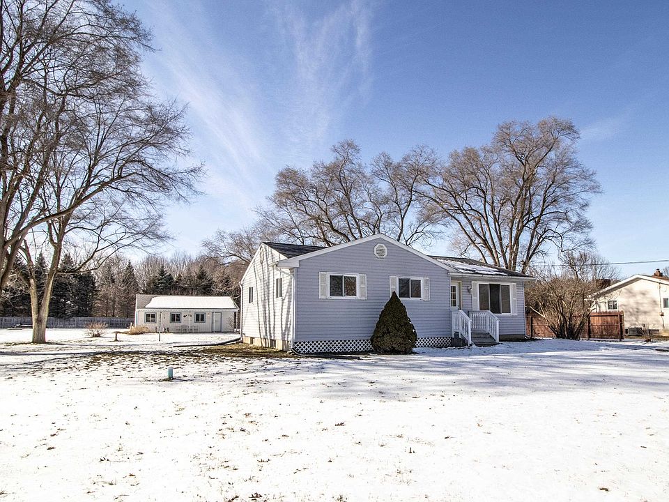 Freshened up and ready for new owners! This 3 bedroom 2 bathroom ranch has hardwood floors throughout. The kitchen has new flooring and bright sunlight coming in from the windows, plus a cozy natural fireplace. An unfinished basement is perfect for storage and has washer/dryer hookups. Outside, the back deck overlooks the 1.6 acre property and the 32x30 pole barn/garage with heated workshop space and covered patio siting area. Seller is including a one year home warranty for the new owners.