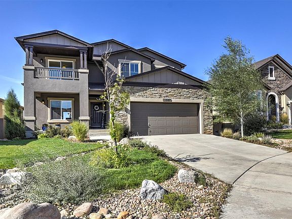 Welcome! This fantastic home is located in the popular Cordera neighborhood on a quiet cul-de-sac. D-20 schools and Master planned community make this home much sought after. It's close to shopping on the Powers Corridor, schools, parks, trails and more! This home features exterior amenities like a front porch, a balcony, stone accents around the garage, easy maintenance stucco and lovely landscaping. Inside the home, you will find a spacious Kitchen that is open to the Dining area and Living room. The Kitchen features a center island with counter bar seating, Stainless Steel appliances including the gas range, granite counter tops, subway tile back splash, tall upper cabinets with crown molding and plenty of counter space! The Dining area has wood flooring and a walk-out to the backyard! The Living room has 2-story ceilings, a cozy gas fireplace to nestle around in the winter months and tons of windows for natural lighting. Also on the main level is a formal Dining room (with carpet),