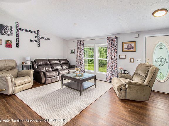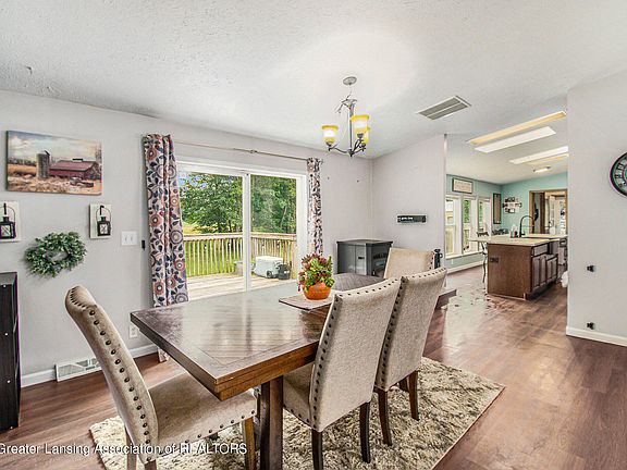Welcome to this captivating 3-bedroom, 2-bathroom home nestled in Haslett, MI at 9037 Braden Rd. Spread across 1620 square feet of living space, on 6.14 acres of land, this home boasts a warm, inviting atmosphere with a smooth flow from room to room that enhances everyday living. The spacious kitchen features a large island that serves as a focal point for gatherings and practical meal preparations. Skylights throughout the home pour in natural light, creating a bright and cheerful ambiance. The living room, outfitted with a wood-burning fireplace, offers a cozy retreat during cooler months. The walkout basement opens to a large yard surrounded by mature trees, providing not only serenity but also the joy of an outdoor lifestyle with a large deck, a hunting stand, and chicken coop. Additional amenities include a main-floor laundry room, ensuite bathroom in the primary bedroom, a 1200 square foot pole barn with ample storage and workspace possibilities, and a 200-amp electrical service to the house and barn. Don't miss out on this opportunity, schedule your showing today! Dimensions are approximate, BATVAI.