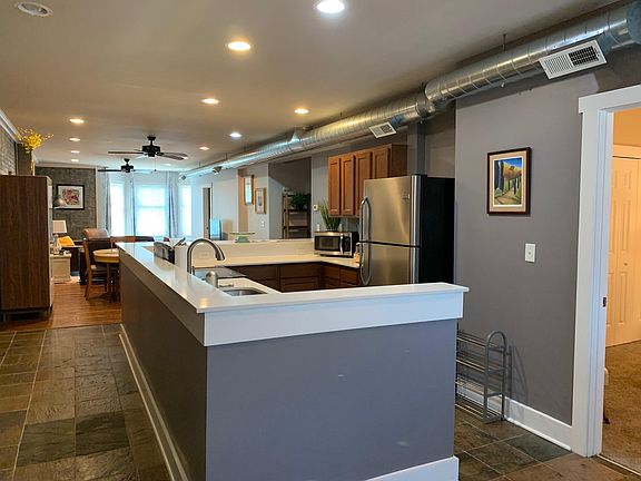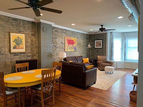 Open concept high-ceiling loft with updates throughout, freshly painted. Exposed Chicago grey brick, hardwood and slate floors, 2 carpeted bdrms with en suite bathrms - each with a queen sized bed. Leather furniture in living room. Fully-equipped kitchen features stainless appliances, new quartz countertops with breakfast bar that doubles as workspace. Located in the Historic District and in the Uptown Arts District...steps to eateries, coffeehouses, outlet mall, farmer's market, etc. One mile to Washington Park Lake Michigan Beach. The facade of our historic building has been recently washed, repaired, and painted. More cosmetic updates are coming through 2022. No heavy construction in or on our building however, so not a noisy place! Owner pays WiFi, gas, and water. Tenant pays electric. One on-site parking spot included. Free street parking is plentiful. NO PETS. NO SMOKING. NO DRUGS. No subletting. This is an upstairs loft with no elevator. Beauty salon directly below the loft.