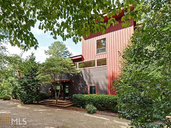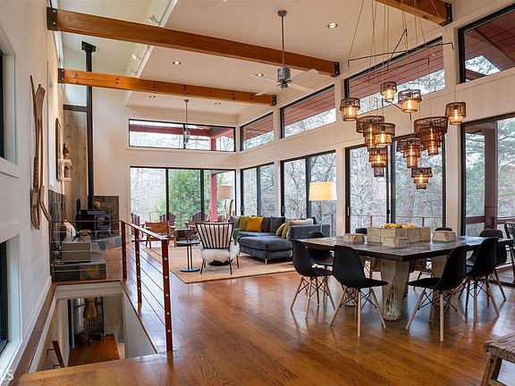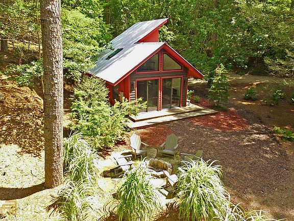 This stunning contemporary home and guest cottage sit on a 1.36 acre serene wooded lot that is only a few minutes from the Lake Rabun marina and Lake Rabun Hotel. This compound features a primary home, The Perch, created by renowned Atlanta designer Jill VanTosh and a mini-me guest home, The Nest, designed by Bob Defiore. The two contemporary homes are designed with a nod to the mountains and feature many unique details such as the bespoke chandelier above a custom dining table. The open-plan great room features enormous windows that bring nature and sun indoors. The well-styled chef's kitchen, outfitted with stainless steel appliances, plentiful custom cabinetry, and concrete countertops, is open to the large gathering room. A gracious wrap-around deck surrounds the living areas and opens to a screened-in porch. The primary bedroom suite is accompanied by a soothing bath area that includes an extra-large steam shower, double vanity, custom cabinets, and an entrance to a screened porch .The second floor boasts another secluded guest room with a private full bath that includes a tile shower. Up another level, the Crow's Nest features a den with large windows with lake views, a TV area, and a sleeper sofa. The terrace level below the main level features a large living space with a fireplace, bedroom area, full bath, and morning kitchen area. The raw concrete and treated lumber trim resonate with the continued elemental feel of the home. A covered patio area is located just a step outside and provides a wonderful source of light and openness. Adjacent to this area is a children's bunkroom includes bunk beds, a play area, and a washer-dryer closet. The guest house, constructed in a similar style and look as the main house, includes a full kitchen, living area, a primary bedroom, and a full bath. Outside, a deck overlooks a cozy fire pit that will draw you out for a warm evening gathering. Property is being sold as one, but is actually a combination of two parcels. Either the main house or the guest house could be sold separately by a new owner. Interior painting and changes are in process and new photos will be available soon.